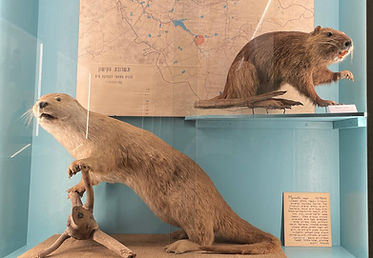 בקיר הצפוני של המוזיאון מוצבים שני חלונות תצוגה צרים, שתכליתם המקורית הייתה להשוות בין נחל הקישון לפני קום המדינה, לבין מצבו בשנת 1974, השנה בה עוצבה התצוגה. האוצרים היו: איש הטבע אילן טל, והצייר וולטר פרגסון (Walter Ferguson). שימו לב לתאריכים שעל המפות. עיצוב החלונות לא הושלם, וכיום מוצגים בהם יונקים גדולים.